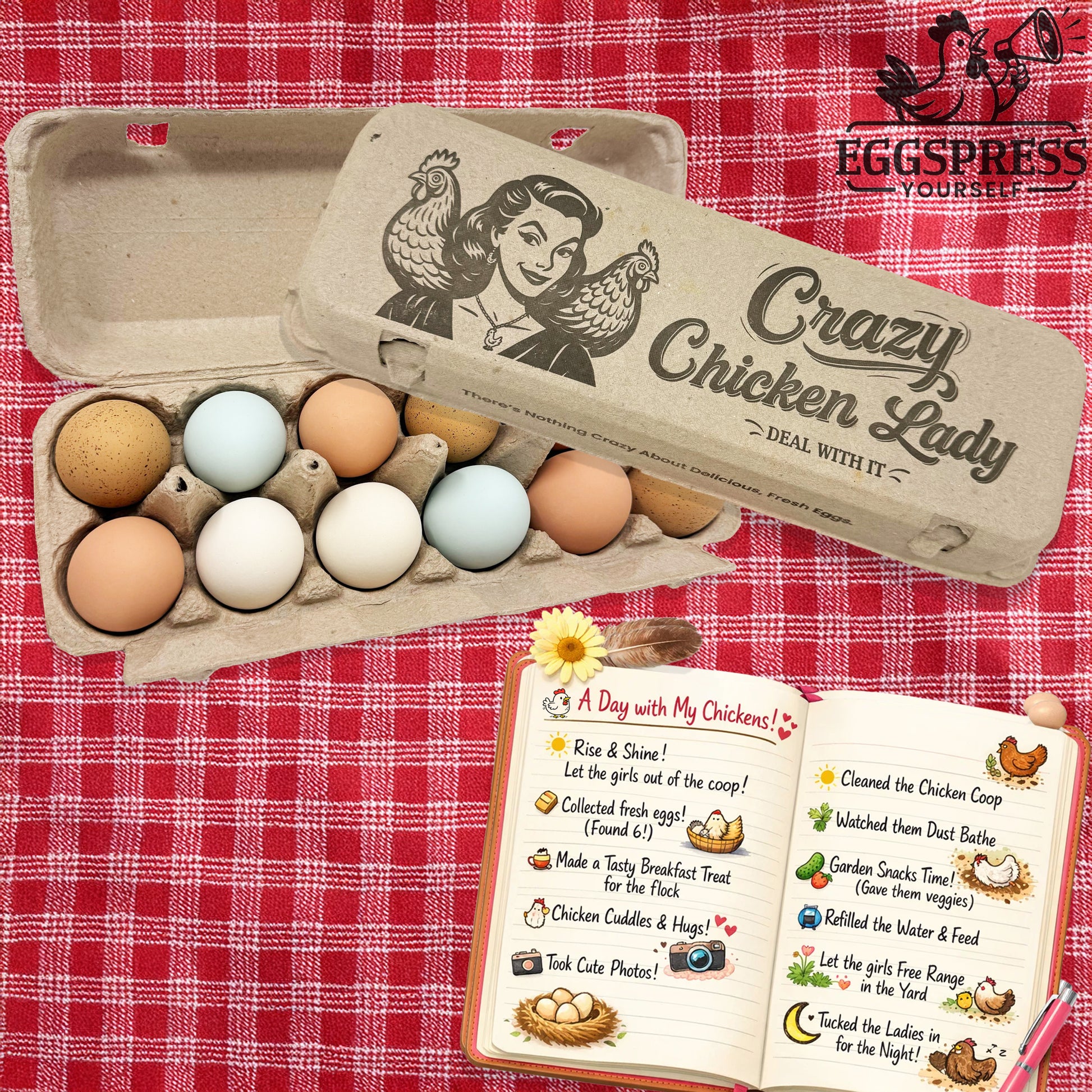 Elevate your egg game with our Crazy Chicken Lady paper egg carton, featuring a bold illustration of a fierce woman rocking a chicken on each shoulder and the unapologetic slogan: “Crazy Chicken Lady… Deal With It.” This carton is a love letter to the woman who names every hen in her flock, chats with them like lifelong pals, and wears her chicken obsession like a badge of honor.