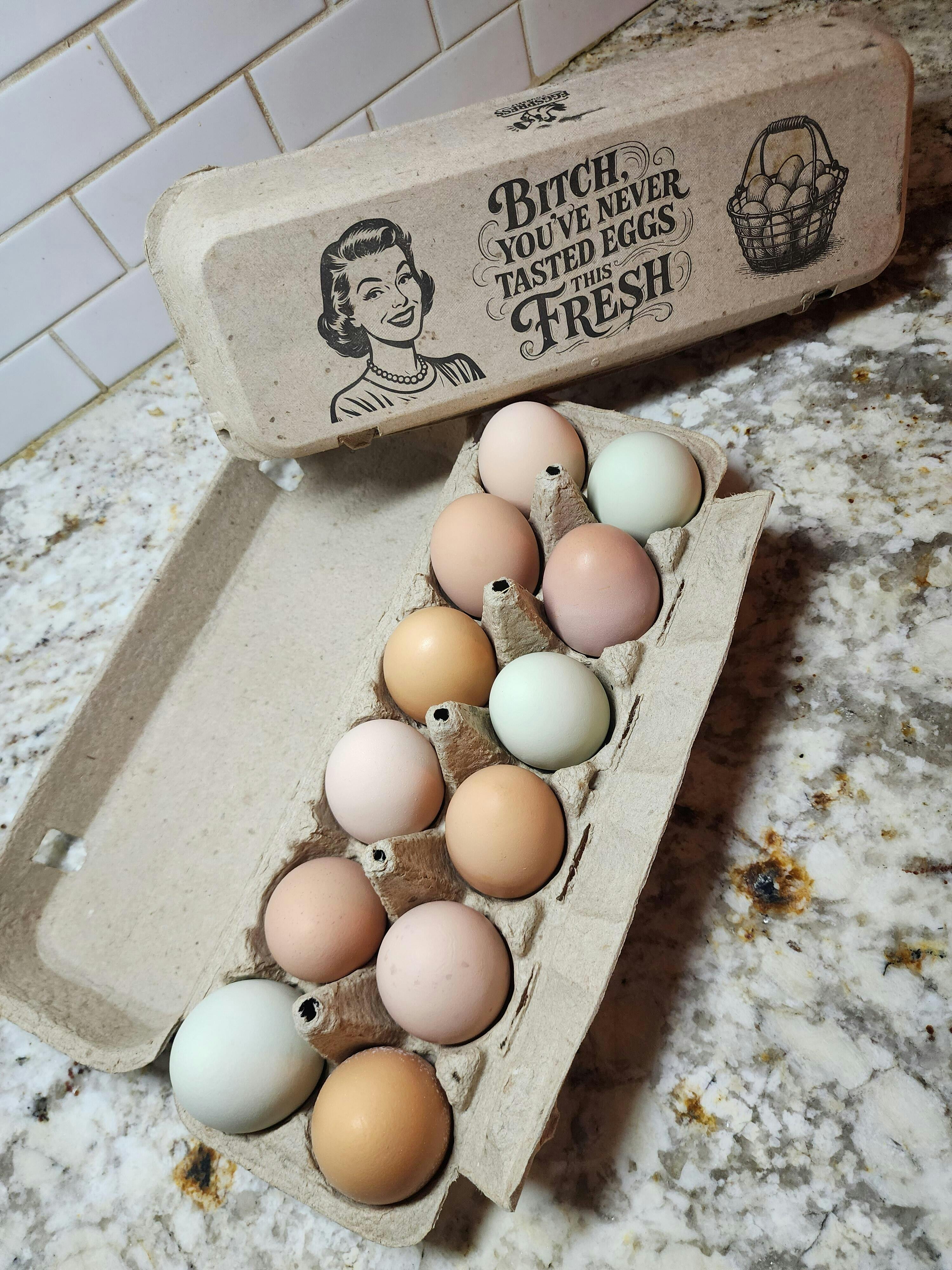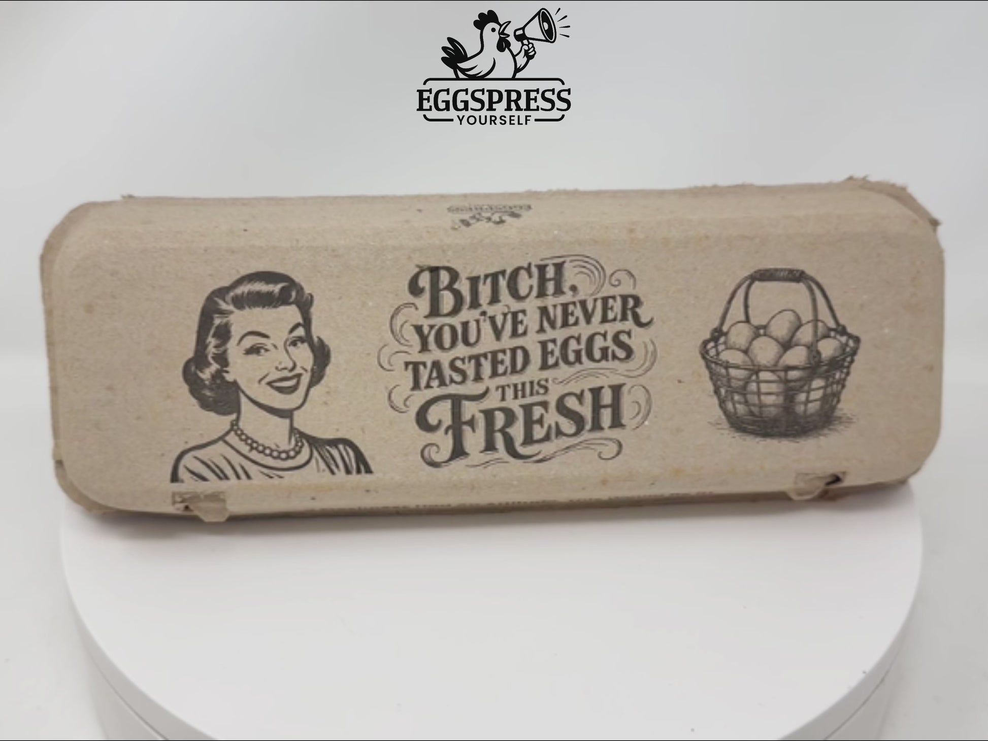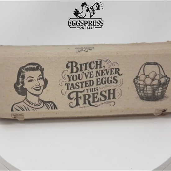 For those who know their eggs and own their attitude, this delightfully bold egg carton features a pleasant, smiling retro woman who’s clearly over dull breakfasts and mediocre eggs. With the ironic declaration, “Bitch, you’ve never tasted eggs this fresh,” her cheerful demeanor adds a playful twist, delivering farm-fresh swagger with a wink and a smirk—turning every dozen into a statement of bold flavor before you even crack a shell.