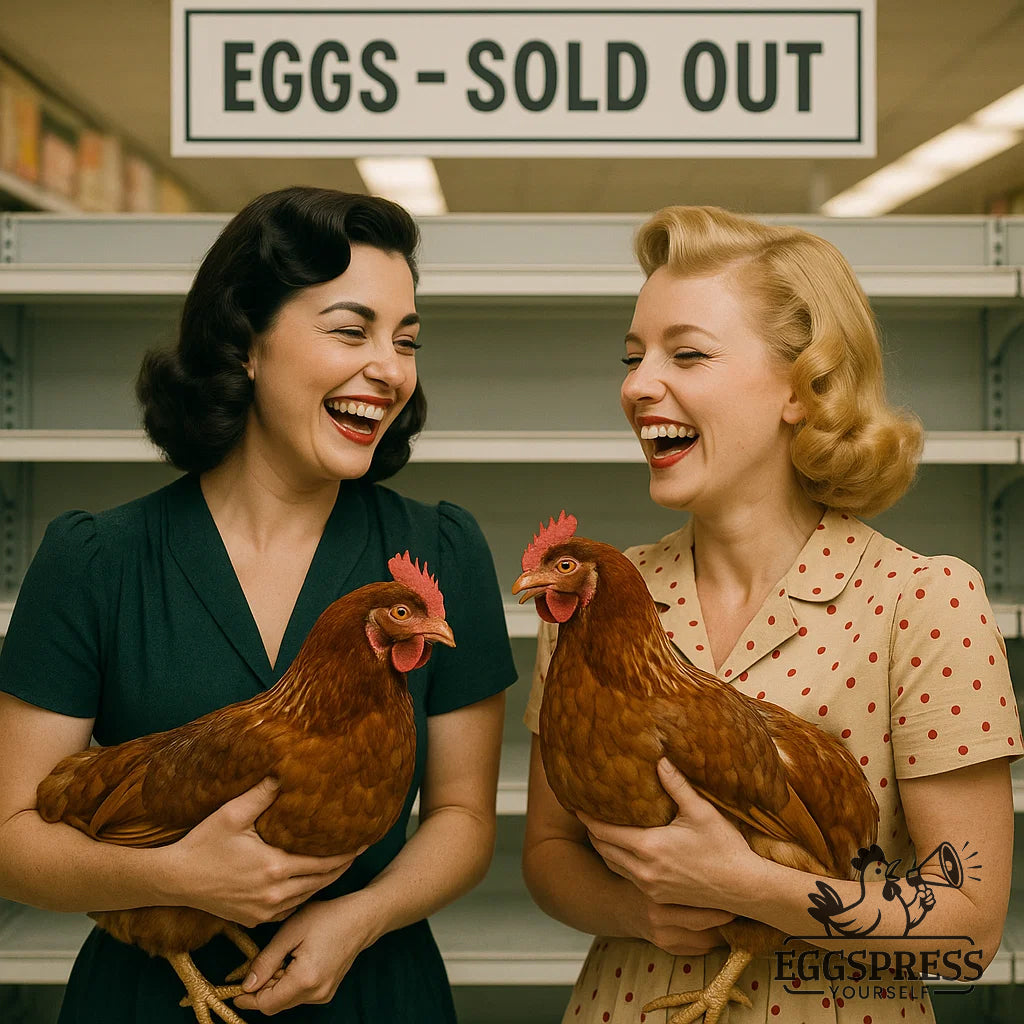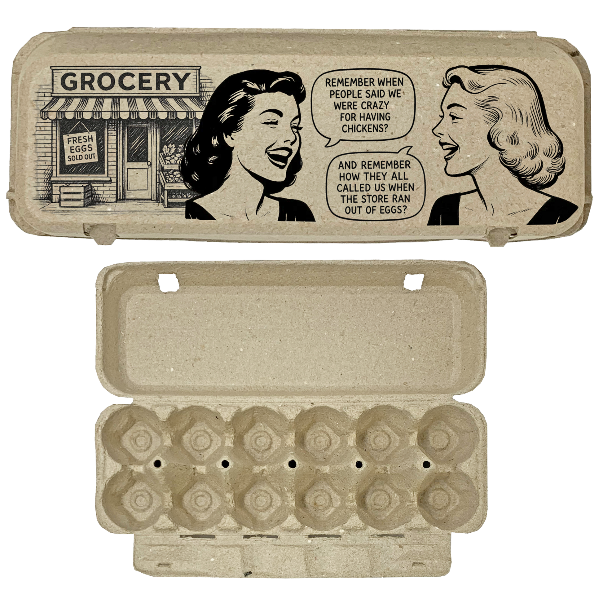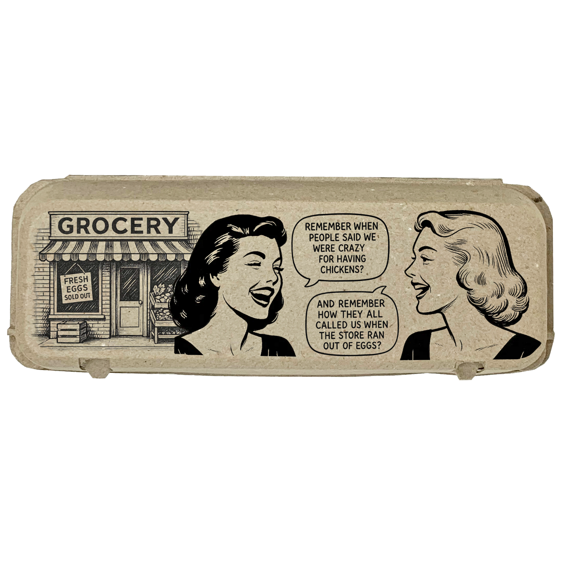 Stock up and chuckle with our Fresh Eggs Sold Out paper egg carton, featuring a quirky grocery store front with a "Fresh Eggs Sold Out" sign and two women sharing a laugh. One quips, "Remember when they said we were crazy for having chickens?" while the other replies, "And remember how they all called us when the stores ran out of eggs?"—a hilarious nod to backyard hen triumph! This carton celebrates the savvy egg keepers who always have the last laugh.